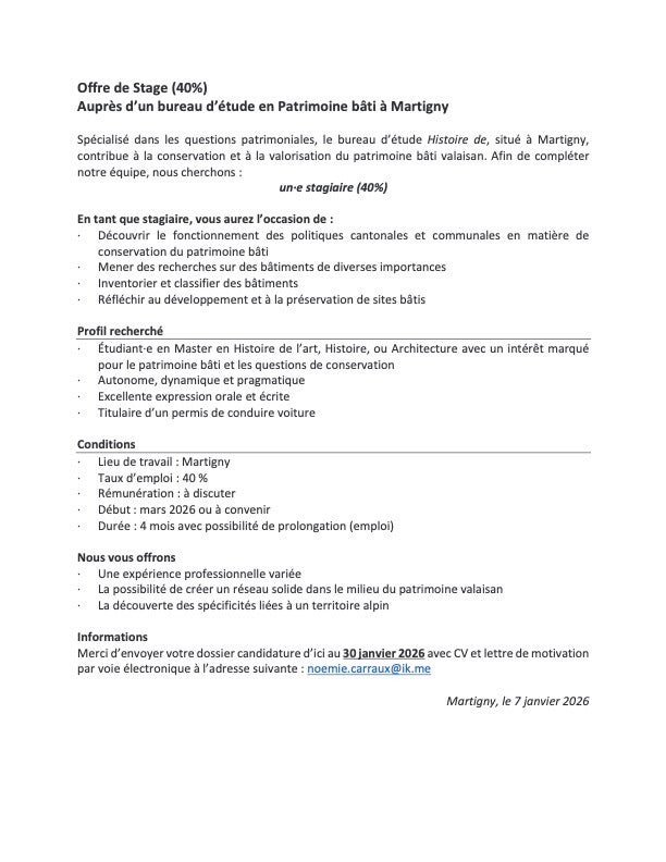 Afin de compléter mon équipe, je cherche un·e étudiant·e en master ou jeune diplômé·e en histoire de l'art, histoire ou architecture, désireux·de d'effectuer un stage au sein de mon bureau.